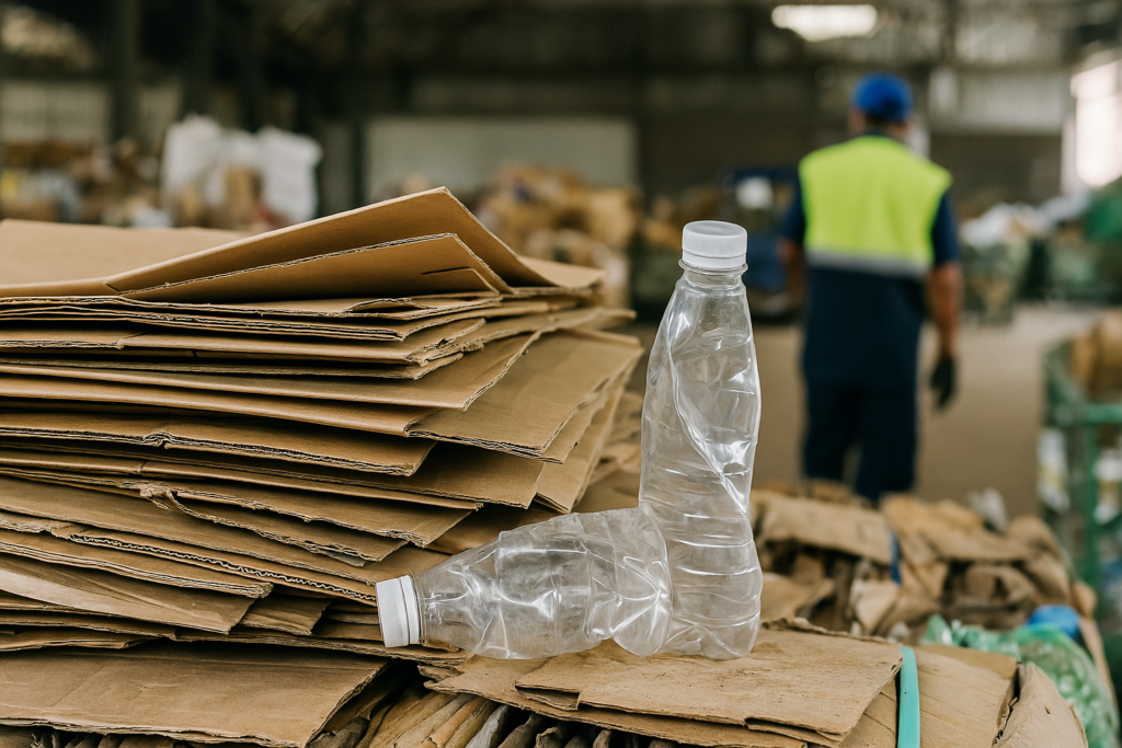 Frascos de cosméticos, garrafas PET, latas de alumínio, caixas de papelão.